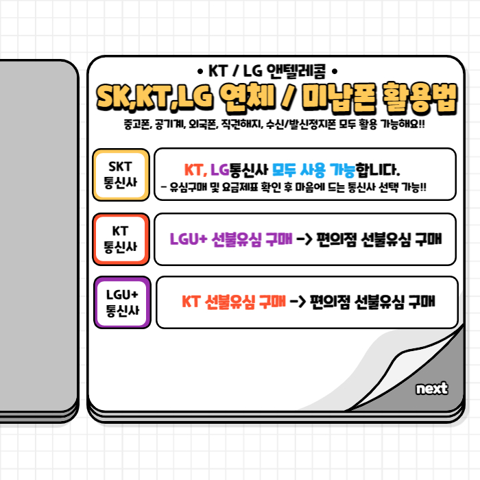 다만 KT통신사의 경우 핸드폰 요금을 미납하였다면 같은 계열사 통신사는 인식이 안되기 때문에 LG앤텔레콤으로 개통하여하며, 반대로 LG통신사에 핸드폰 요금을 미납하였다면 KT앤텔레콤으로 개통해서 편리하게 사용하시면 됩니다.