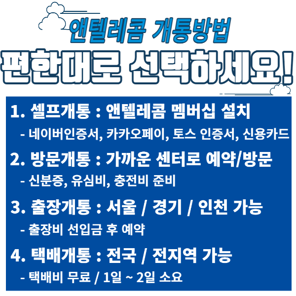 4) 택배개통 : 2번 ~ 3번이 안 될 경우에는 택배로 유심을 보내드립니다. 자세한 건 카톡으로 문의하시면 상세히 설명드리겠습니다!!