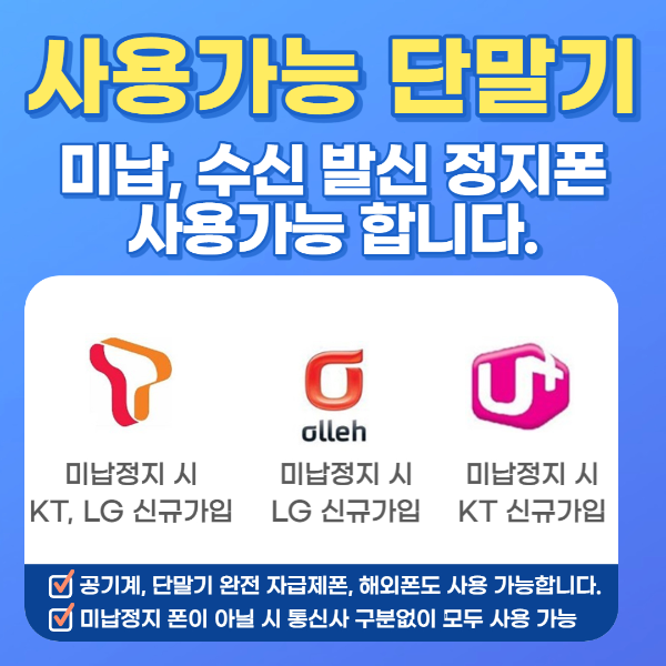 통신사 연채 미납 폰, 수신정지핸드폰, 발신정지핸드폰, 공기계, 단말기 완전 자급제폰, 중고폰도 모두 사용 가능합니다. 이점은 참고해주시고, 이 것 외에도 궁금하신 게 있다면 언제든지 연락 주세요!!