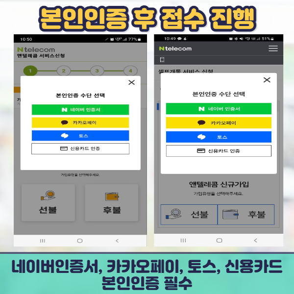 1) 앤텔레콤 셀프개통 : 네이버인증서, 카카오페이, 토스, 신용카드 중 한 가지로 본인인증 후 비대면 셀프개통 신청