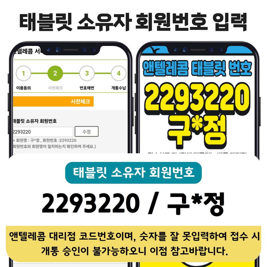2293220를 입력 후 조회를 누르면 구*정으로 보이게 될 겁니다. 이렇게 표시가되면 정상적으로 접수가 된 거예요. 고객님들의 핸드폰에서 최종적으로 완료되면 저에게 접수가 되는데 태블릿 PC에 개통 관련 전산이 들어가 있기 때문에 태블릿 소유자 회원번호라고 표시가 되는 거예요.