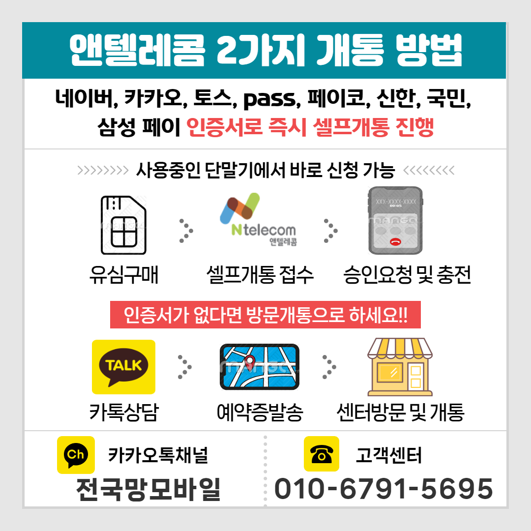 1. 비대면 셀프개통 : 네이버, 카카오, 토스, PASS, 페이코, 신한, 국민, 삼성페이 중 하나라도있다면 가까운 편의점에서 선불유심을 구매 후 본인인증 및 앤텔레콤 멤버십에서 편리하게 개통 신청을 진행하시면 됩니다.(아래 자세히 설명되어 있습니다.)