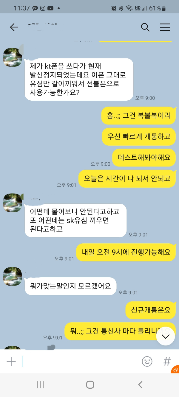 아래 사진은 실제 문의를 주신 고객님이십니다. SK통신사에 미납으로 인해서 발신정지가 되었는데 사용하는 단말기 그대로 선불유심만 본인명의로 개통해서 사용할 수 있는지 물어봐주셨습니다. 아래에서도 자세히 설명드리겠지만 연채 미납 폰 이어도 그대로 사용 가능합니다. 단 확인사항은 있으니 아래 글을 끝까지 읽어주세요!!