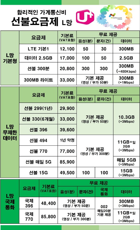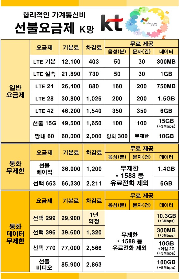 요금제표를 보시고 사용하고 싶은 요금제를 선택하시면 됩니다. 요금제 앞에 보시면 (약정)이라는 문구가 보이실 겁니다. 이 요금제는 1년 치 / 6개월 치 요금을 한 번에 충전 후 사용하는 요금제에요. 가격은 저렴하지만 한번에 충전하는 게 부담이신 분들은 (약정)이 없는 요금제를 선택해주시면 됩니다.