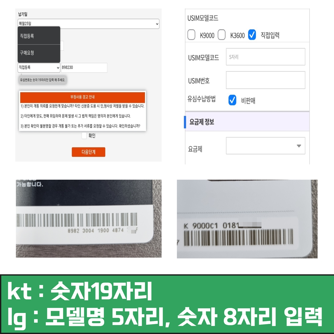 - 모델명 : 알파벳 + 숫자 4자리 / USIM 번호 : 숫자 8자리를 정확히 입력해주시면 됩니다!