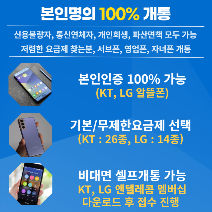 내가 이용 할 요금을 미리 충전해서 사용하는 것 이기 때문에 저렴하면서 가성비가 좋은 요금제를 찾는 MZ세대 고객님들이나 현재 내가 신용불량자나 통신연채자 개인회생 및 파산신청을 진행하더라도 본인명의로 편리하게 사용할 수 있습니다.