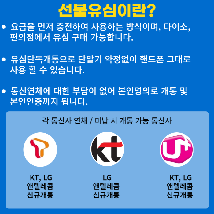 선불유심에 대해서 잘 모르시는 분들이 계셔서 짤게 설명드리겠습니다. 선불유심은 말 그대로 사용하고 싶은 요금제를 선택하신 후 개통이 완료되면 매달 먼저 충전하고 사용하는 선진국형 선불요금제입니다.