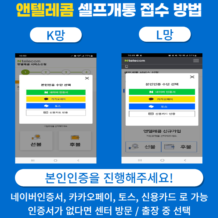A. 셀프개통 : 네이버 인증서, 카카오 페이, 토스를 가지고 계시다면 고객님께서 직접 유심을 구매하여서 셀프개통을 진행할 수 있습니다.