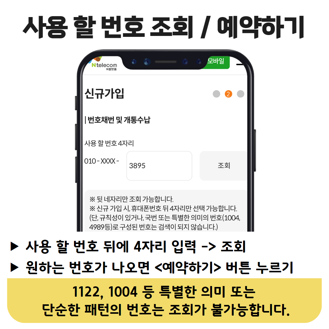 사용하고 싶은 번호 뒤에 4자리를 입력 후 조회를 눌러주세요. 그리고 마음에 드는 번호가 있다면 예약하기를 진행하시면 됩니다.