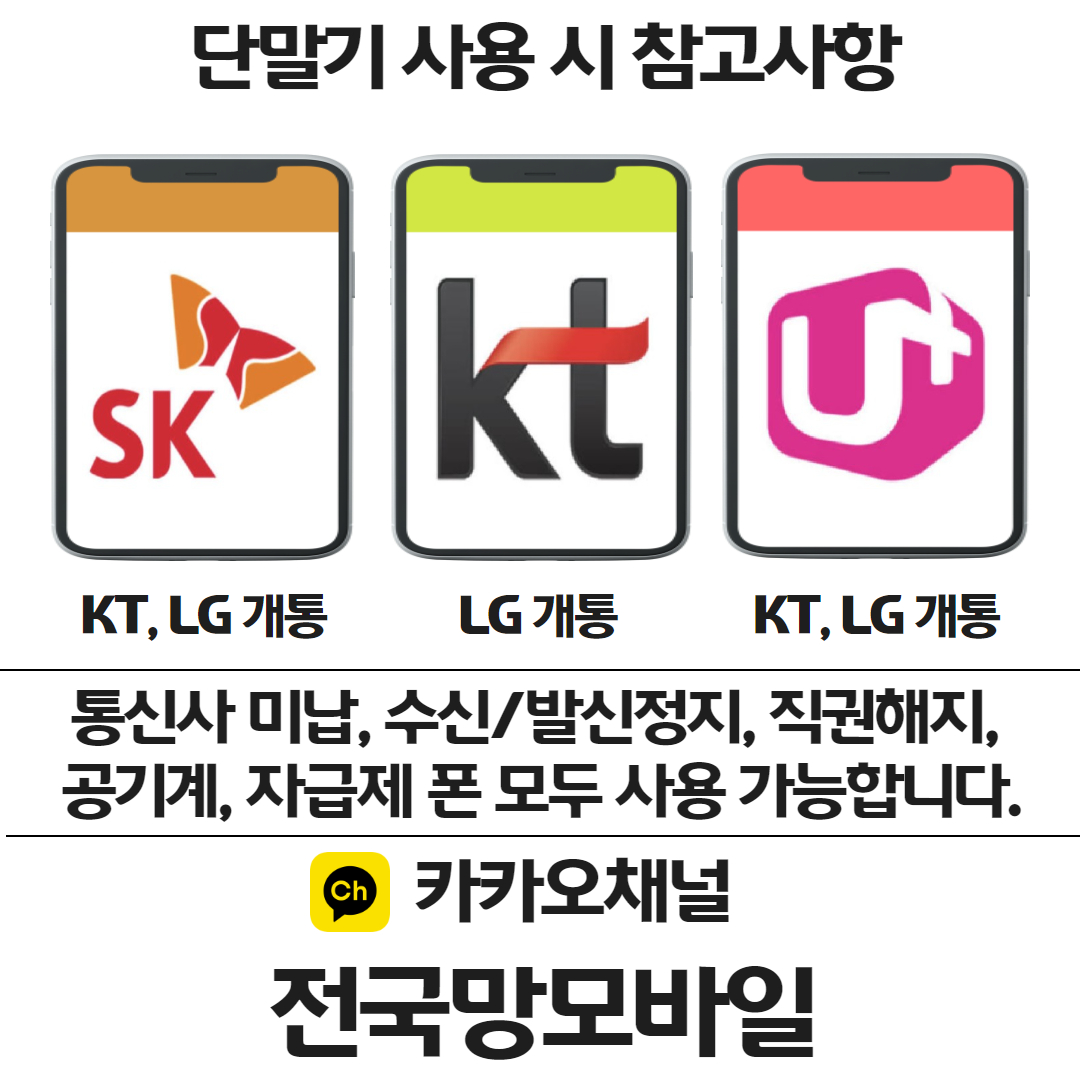 뿐만 아니라 중고폰, 수신 / 발신정지 핸드폰, 직권해지 폰, 자급제 폰 등 바로 사용할 단말기가 있다면 바로 사용 할 수 있습니다. 단말기만 재사용할 수 있어도 추가적으로 들어가는 비용부담이 줄어들기 때문에 이점도 참고해서 적극적으로 활용하시면 좋을 것 같습니다.