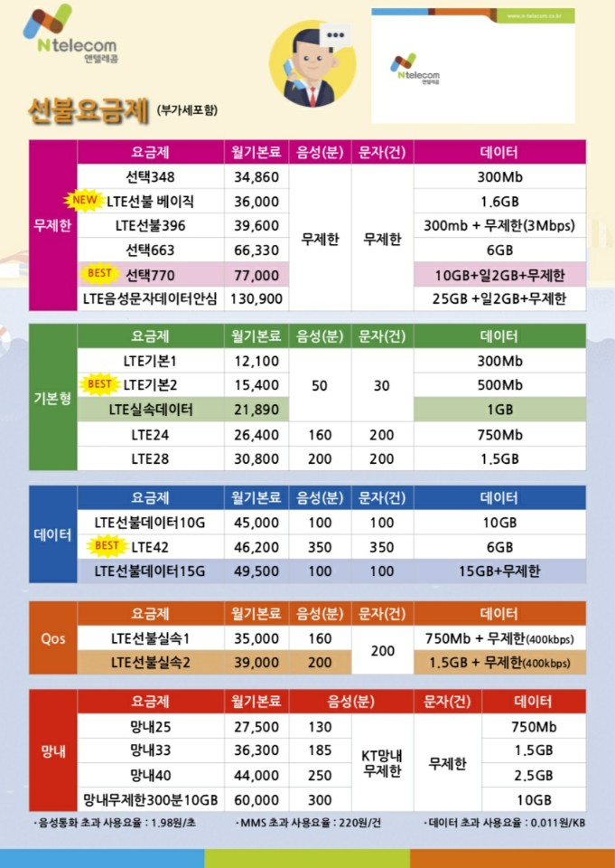 앤테렐콤에는 kt요금제와 lg요금제 두 가지가 있습니다. 마음에 드시는 통신사를 선택하시고 요금제를 보신 후에 앤텔레콤 어플에서 선택해서 사용하셔도 되고요. 대표적으로 많은 소비자분들이 선택하는 요금제를 말씀드릴게요!!