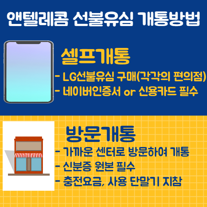 셀프개통을 희망하시는 고객님들께서는 유심구매부터 개통신청까지 절차를 알고 진행하셔야 합니다. KT와 LG 선불유심구매 방법은 문의하시면 빠르게 답변드릴 테니 꼭 확인 먼저 하시고 진행해주시기를 바랍니다.